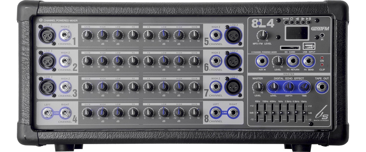Con capacidad para 8 canales, de los cuales 2 son exclusivos para entrada de línea, ideales como entradas de reproductores externos. Con un amplificador alimentado por fuente simétrica única que permite un acoplamiento directo a la salida brindando una respuesta inmejorable en bajas frecuencias con una potencia de 420 W cuando es conectado sobre una carga de 2 ohms , las consolas BACK STAGE pueden manejar con total estabilidad. Incorpora además en su etapa de efectos un módulo digital de eco, conectores del tipo XLR para sus entradas balanceadas de baja impedancia y conectores de tipo telefónico de 1/4 para las entradas balanceadas de alta impedancia y de línea en cada uno de los canales.