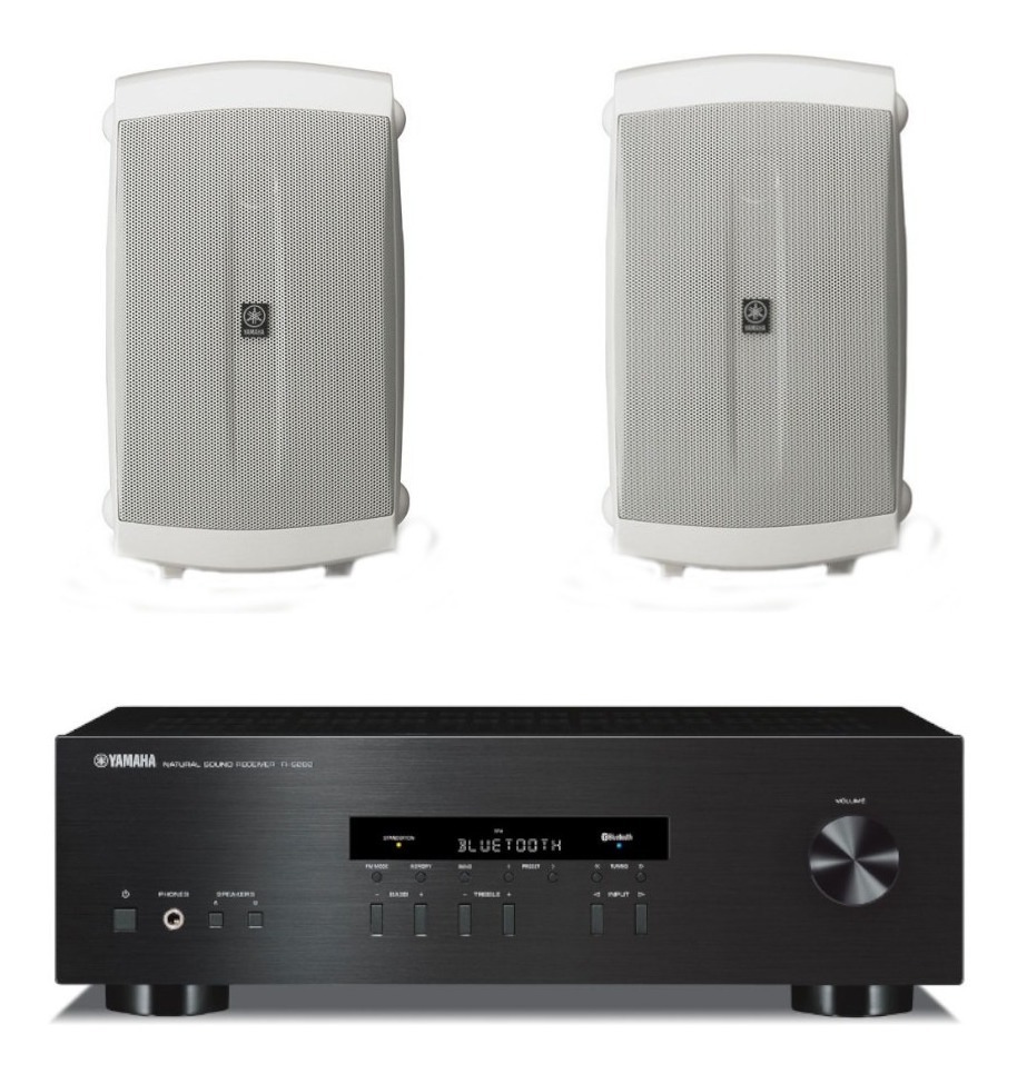 Kit de equipo de audio para casa , negocio, jardín, incluye amplificador con bluetooth y 2 bocinas de sobreponer en pared pueden ponerse en intemperie , color blanco .